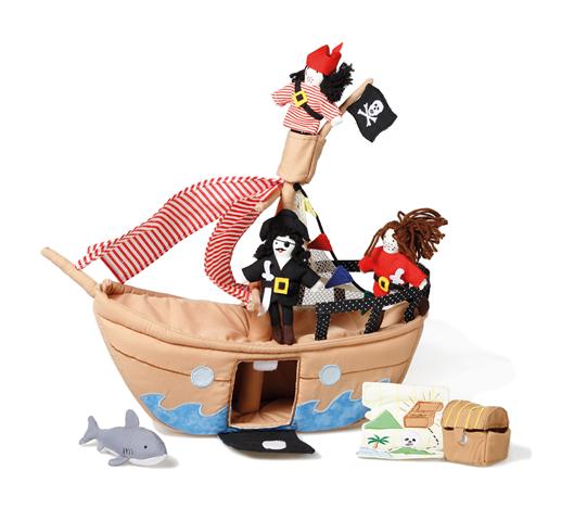 Het piratenschip van het merk Oskar en Ellen heeft veel leuke en speelse details. Inclusief kapitein, twee piraten, loopplank, kanon, schatkist, schatkaart en haai